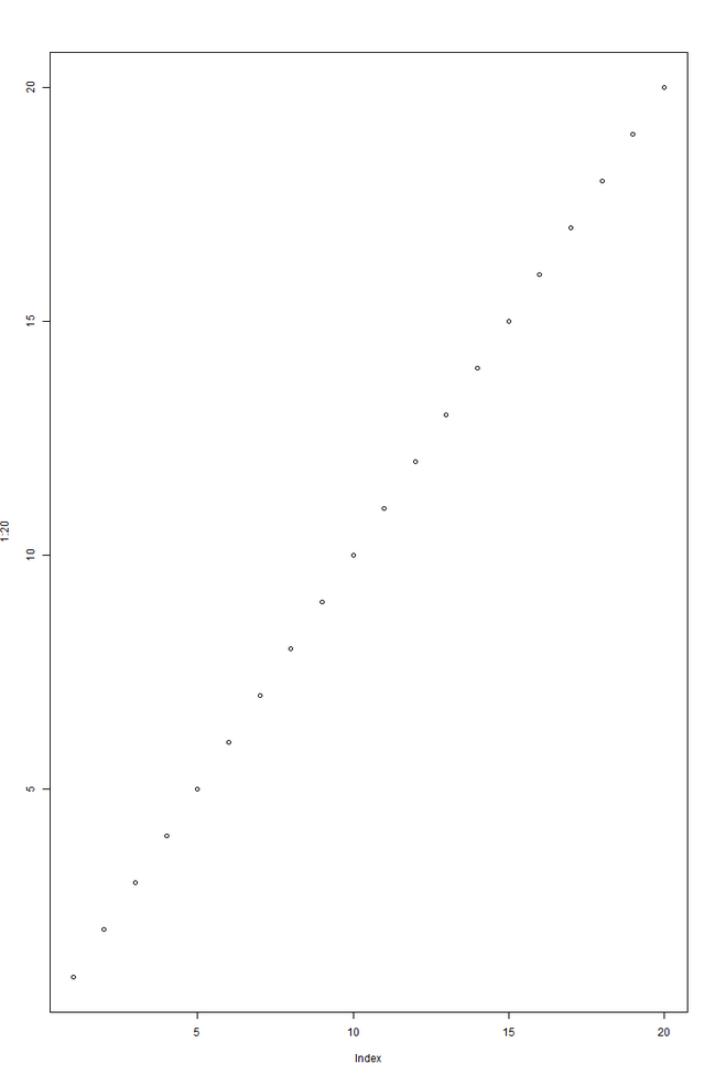 Som vi kan se skapar plot(1:20) ett enkelt punktdiagram där både x-axeln och y-axeln automatiskt fylls med värdena 1 till 20.