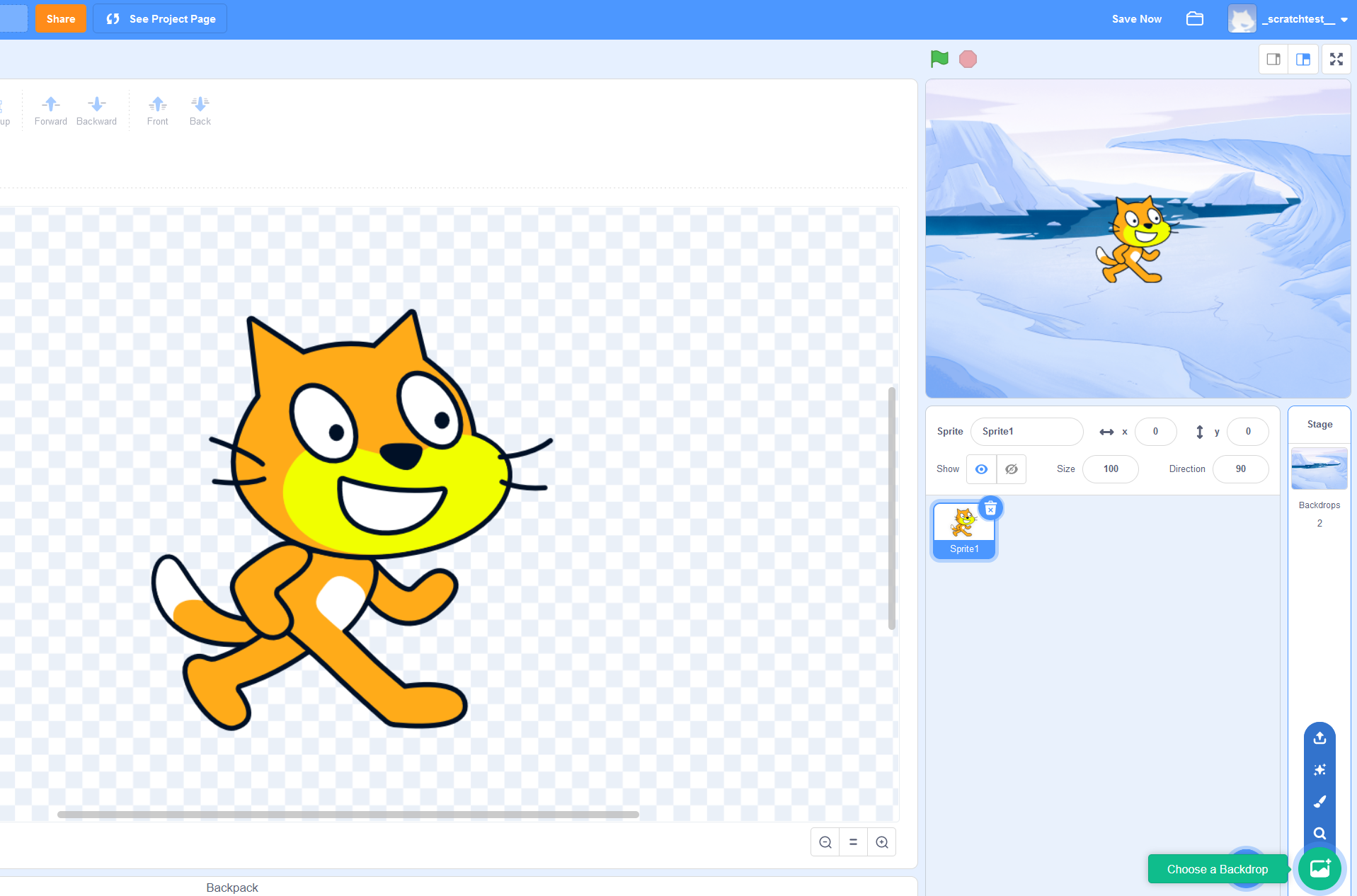 Nästa steg är att infoga en figur i projektexemplet. Eftersom fliken Backdrops för närvarande ligger där fliken Costumes normalt ligger, klickar vi på knappen Choose a Sprite längst ned till höger på skärmen. I Scratch-urvalet finns olika figurer med flera kostymer som kan användas för att simulera rörelsesekvenser. Spriten Cat finns till exempel i två versioner: ”Cat” och ”Cat2”. När bilderna spelas upp efter varandra ger det intrycket att katten går.
