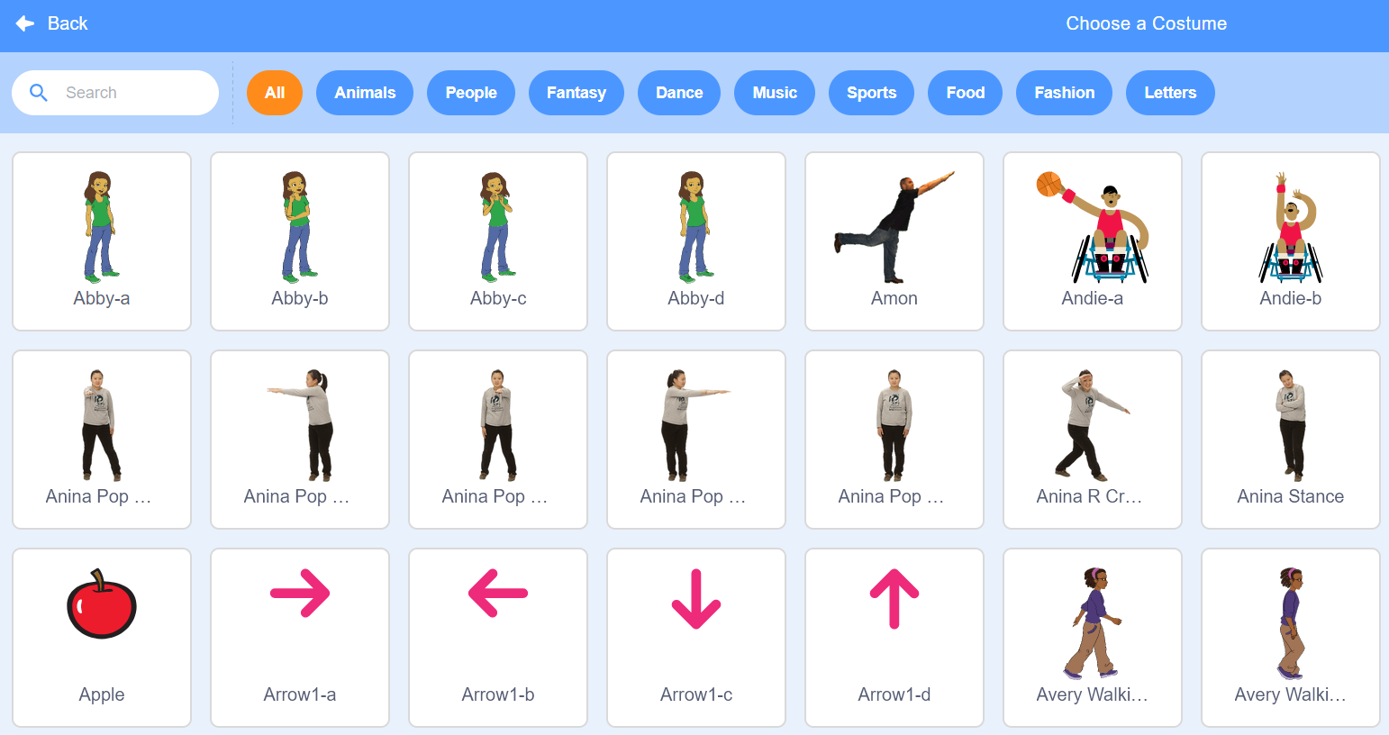 Oavsett om du vill programmera ett spel, en video, en animation eller bara en enkel serie, är sprites (figurer och andra objekt) de centrala byggstenarna för din berättelse. Under fliken Kostymer kan du välja och integrera valfritt antal grafikobjekt i ditt projekt. Du kan välja mellan de tillgängliga bildalternativen, rita objekt för hand eller importera lokalt lagrade grafikobjekt. Om din enhet har en kamera kan du också ta ett foto.