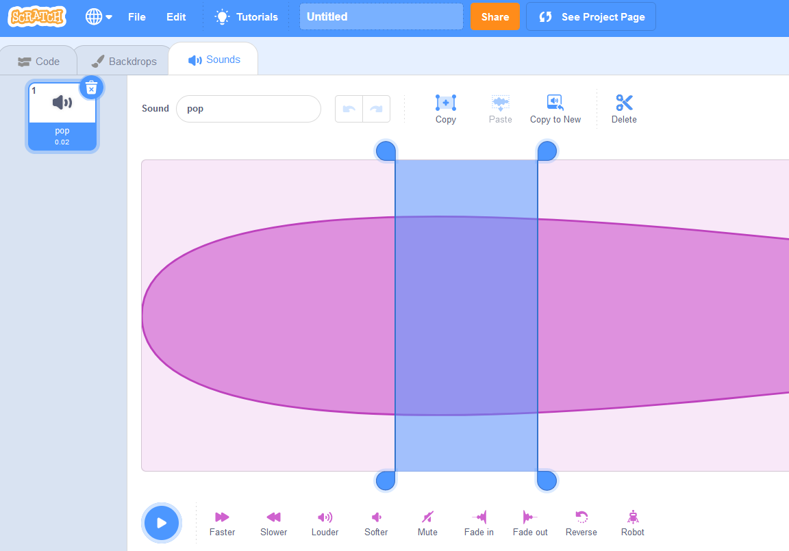 Ljud som du har infogat kan väljas i menyn till vänster genom att klicka på motsvarande miniatyrbild. Du kan sedan redigera ljuden på olika sätt. Du kan till exempel klippa ut valda sekvenser, justera volymen eller öka eller minska uppspelningshastigheten. Eftersom ljud integreras i Scratch-projektet med hjälp av skript, måste varje ljud också ha ett unikt namn, som du kan ange i fältet Ljud.